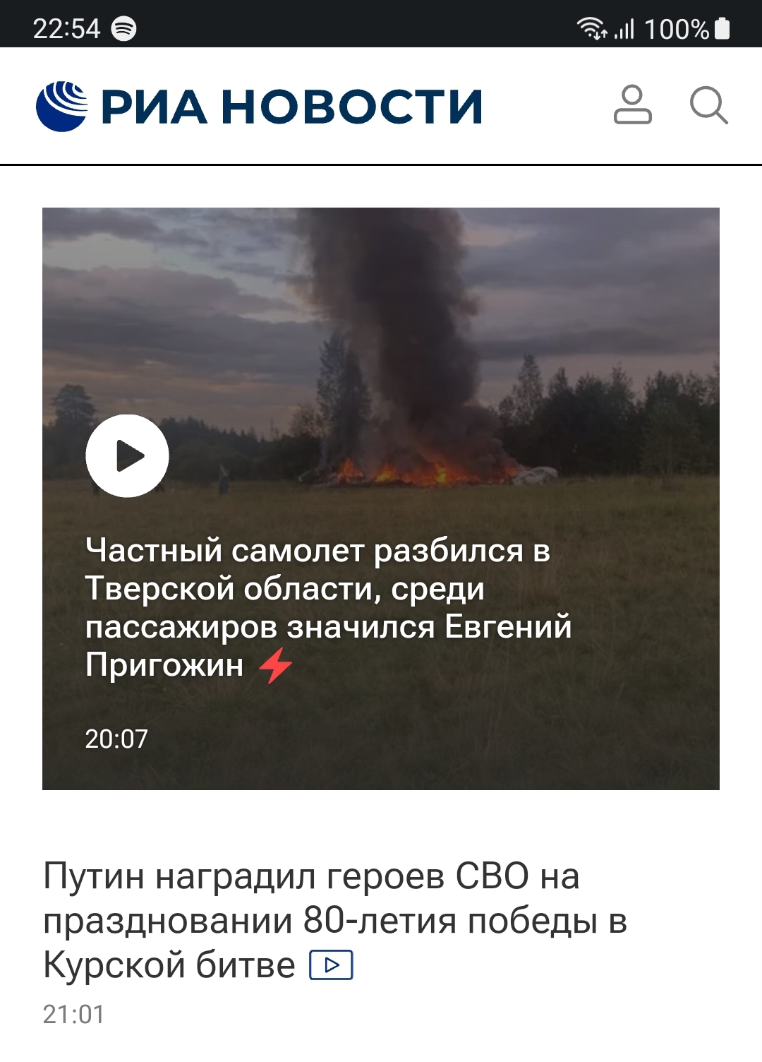 О "смерти" же Евгения Пригожина в сбитом (скорее всего), ну или взорванном самолете в Тверской области сначала сообщили самые заслуживающие доверия компетентные источники - Ксения Собчак и издание "Фонтанка", - а потом и еще более заслуживающие внимания федеральные телеканалы, так что я почти уверен, что это такая операция по договоренному исчезновению Пригожина из зоны видимости, а дальше он всплывет где-нибудь в Африке под именем Исаак Момбасович Чингачгук или Сара Лжеевгеньевна Африканских.