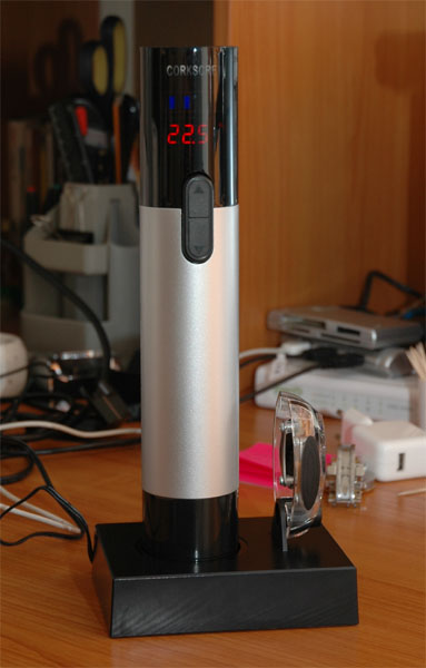 Когда джентльмену нужно выпить, берется бутылка вина и начинается священнодействие. Сначала специальным устройством горлышку делают обрезание, чтобы обнажилась пробка. Затем гаджет снимается с кредла, надевается на горлышко, далее нажимаете кнопку - штопор вгрызается в пробку и вытягивает ее из бутылки. Термометр при этом показывает температуру внутри бутылки. После того как пробка вынута, нажимаете вторую кнопку - пробка выезжает из устройства. Ну и все.