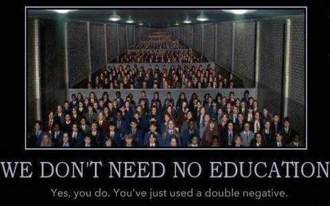 It's just an idiomatic or very informal way of saying "We don't need any education"