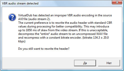 2. Запускаете Virtual Dub Mod, открываете там файл AVI. Если возникает вот такое окно (значит, звуковая дорожка записана с переменным битрейтом) - обязательно ответьте No, иначе будет рассинхронизация звука. (Это для "Теории большого взрыва", потому что в некоторых других случаях рассинхронизация происходит в любом случае, и там приходится еще и геморроиться отдельно со звуковой дорожкой - вытаскивать ее, переводить в постоянный битрейт, затем заново приклеивать.)