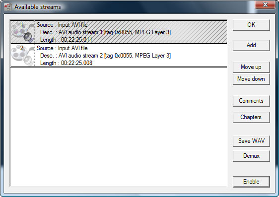 3. Далее если в AVI зашиты две звуковые дорожки, а вам нужно оставить только одну, заходите в Streams - Stream List и на ненужной дорожке (в данном случае - первая, дубляж) делаете Disable.