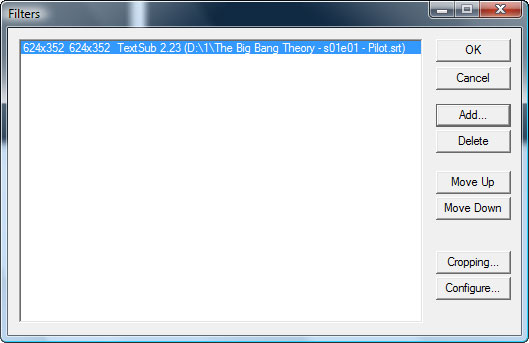 4. Теперь нужно приклеить субтитры. Для этого заходим в Video - Filters. Там нажимаем Add  и в списке выбираем Text Sub. Откроется окно, в котором предложат выбрать файл с субтитрами - указываем его. В настройках ничего не меняем. Добавленный фильтр будет выглядеть вот так.