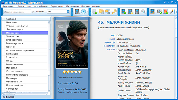 • вносить информацию о фильме-сериале, вводя название и получая автоматом данные от "Кинопоиска" или IMDB (лучше от IMDB);