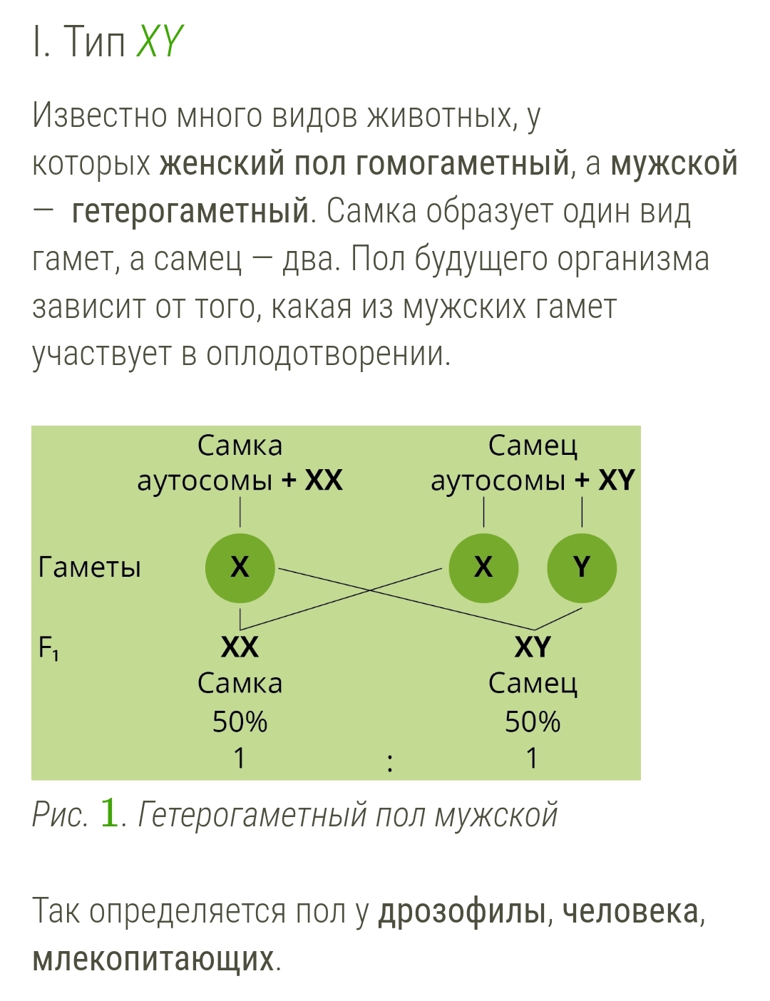 Женским считается организм, имеющий две X-хромосомы, мужским — организм, имеющий одную Y-хромосому и одну X-хромосому.