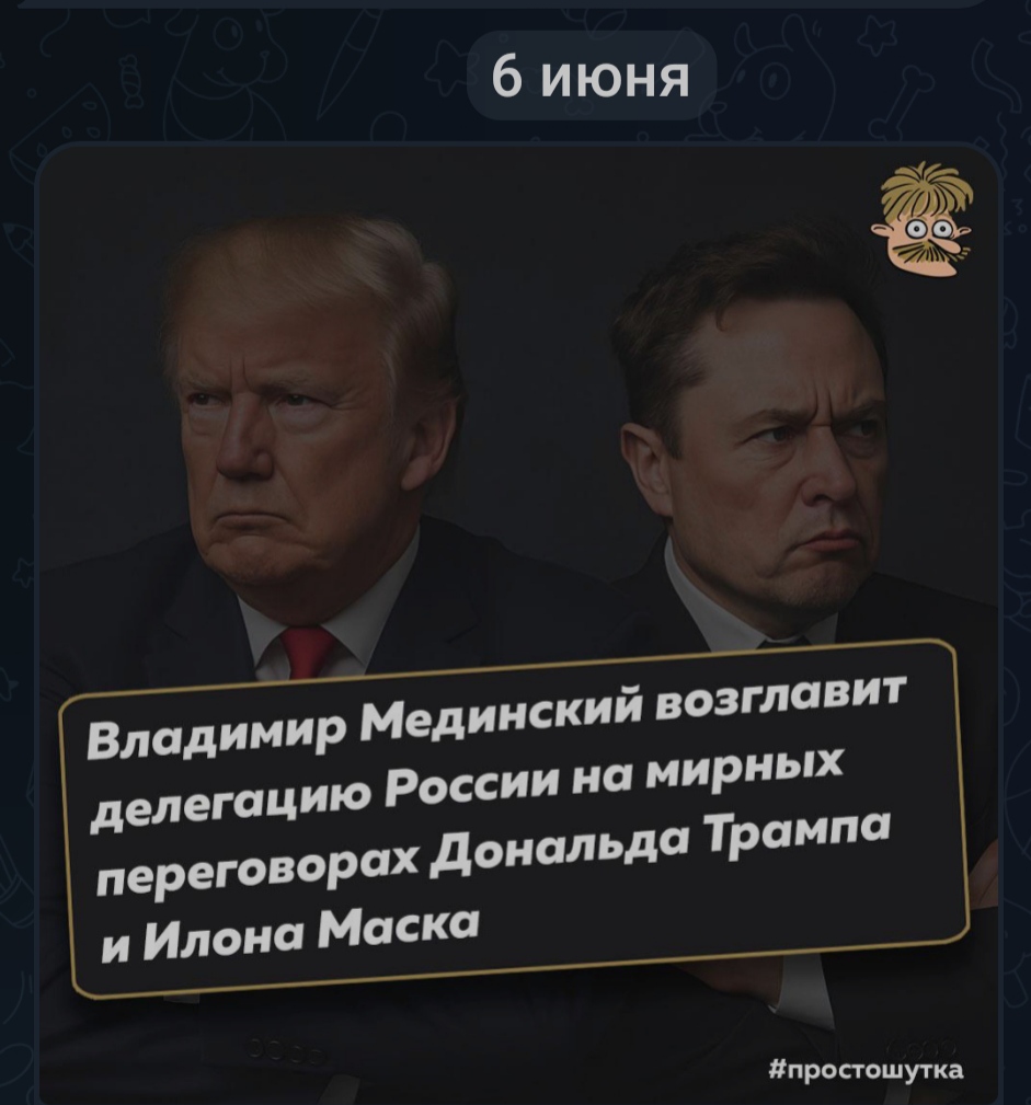 Вы шутите, а Медведев всерьёз предлагает своё посредничество для примирения Трампа с Маском. За своё миротворчество он хочет акции старлинка.