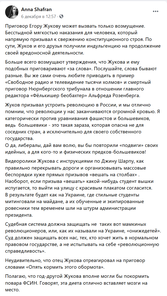 Но вообще говоря, она права. К Жукову может быть только два подхода, ИМХО - то, что он делал, абсолютно допустимо и правомерно - и тогда он должен быть оправдан. Либо любые действия, подчеркиваю - любые, направленные против власти, противоправны - и тогда ему надо было минимум пятерочку дать. Нынешний приговор - ни в какую из этих логик не укладывается.
