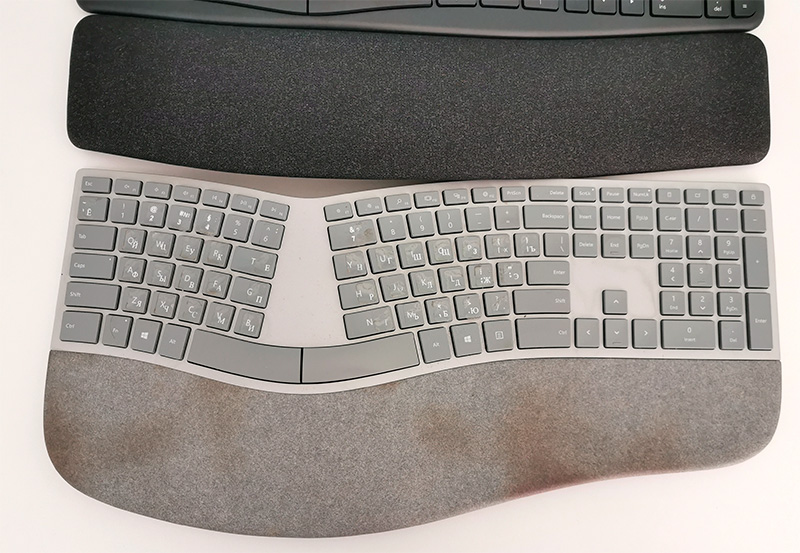 Ну и посмотрим, насколько быстро и как заляпается подставка под запястья. У клавиатуры MS подставка слишком светлая, и она быстро пришла в совершенно нетоварный вид. Это при том, что я ее довольно часто чищу спиртом. Но этот материал полностью отчистить невозможно.