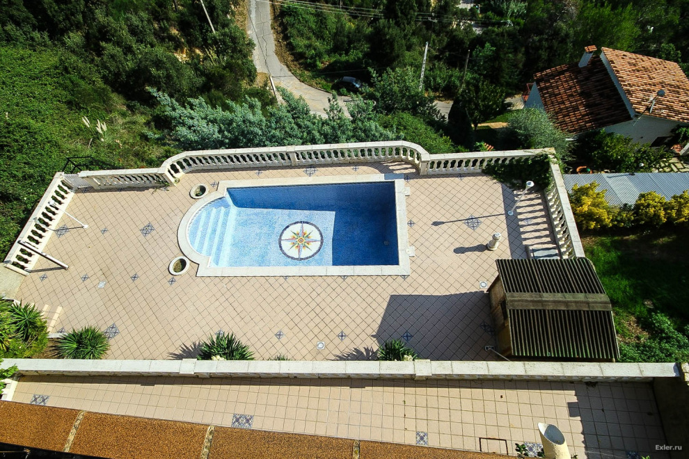 Вид сверху на большую нижнюю террасу с бассейном. Рядом с бассейном - сауна.