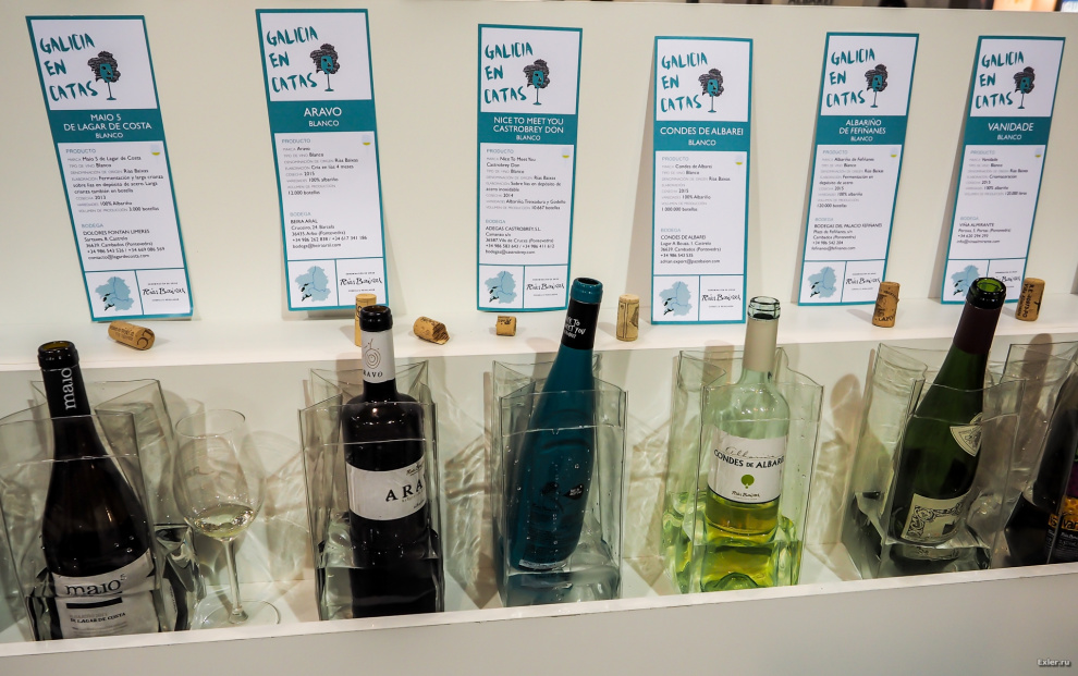 В прошлом году регион Rueda устраивал отрытый бар для дегустаций, чем меня очень порадовал, потому что я люблю вина из Rueda, а в этом году Галисия сделала открытый бар. Там все просто: куча стендов с открытыми бутылками. Берешь бокал с подноса, берешь кувшинчик для сплевывания и выливания вина, ходишь, пробуешь.