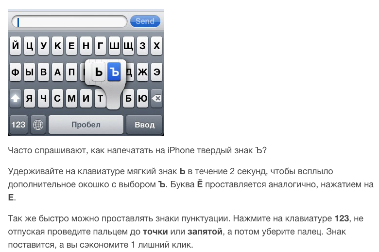 "На стандартной клавиатуре Android при наборе SMS и других текстов нет твёрдого знака, так уж исторически сложилось. Но набрать его очень просто. Достаточно нажать на символ мягкого знака и долю секунды удержать на нём палец. Появится всплывающее поле с твёрдым знаком, который тут же добавится к тексту. Потренируйтесь в наборе твёрдого знака на клавиатуре Андроида сами, и вы легко убедитесь, что набрать в SMS слово «подъезд» или «съехал» очень даже просто.
