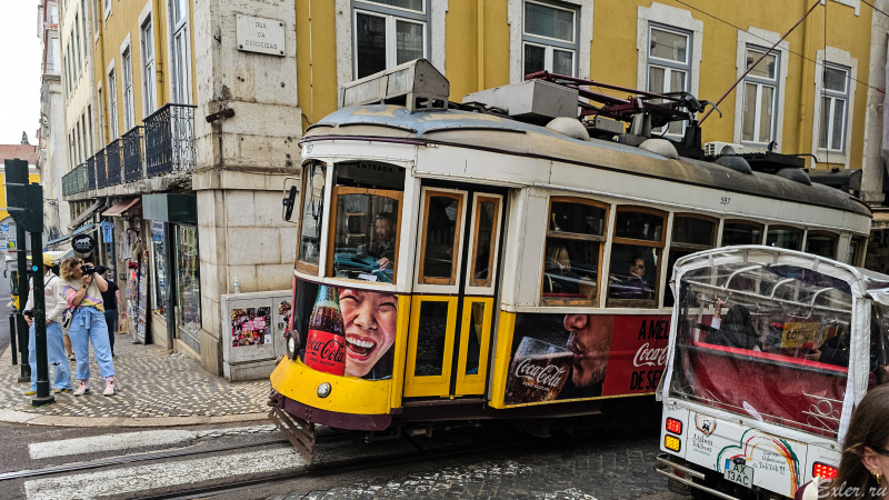 Знаменитый лиссабонский трамвай. В нем едут туристы и фотографируют все вокруг. Туристы вне трамвая фотографируют трамвай и фотографирующих все вокруг туристов в трамвае.