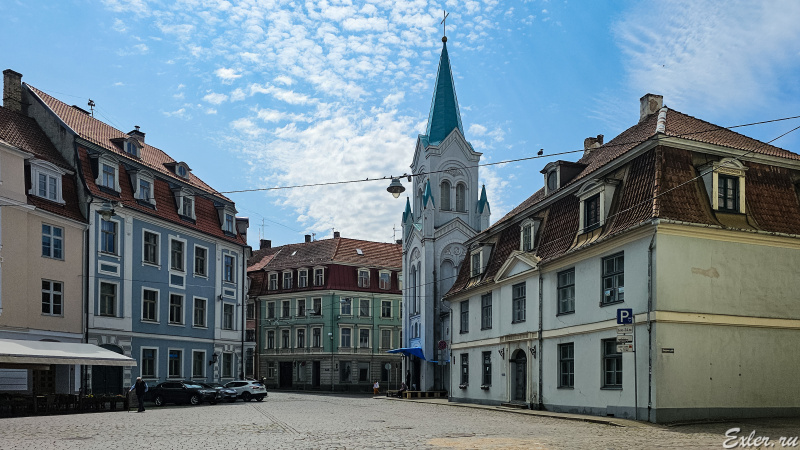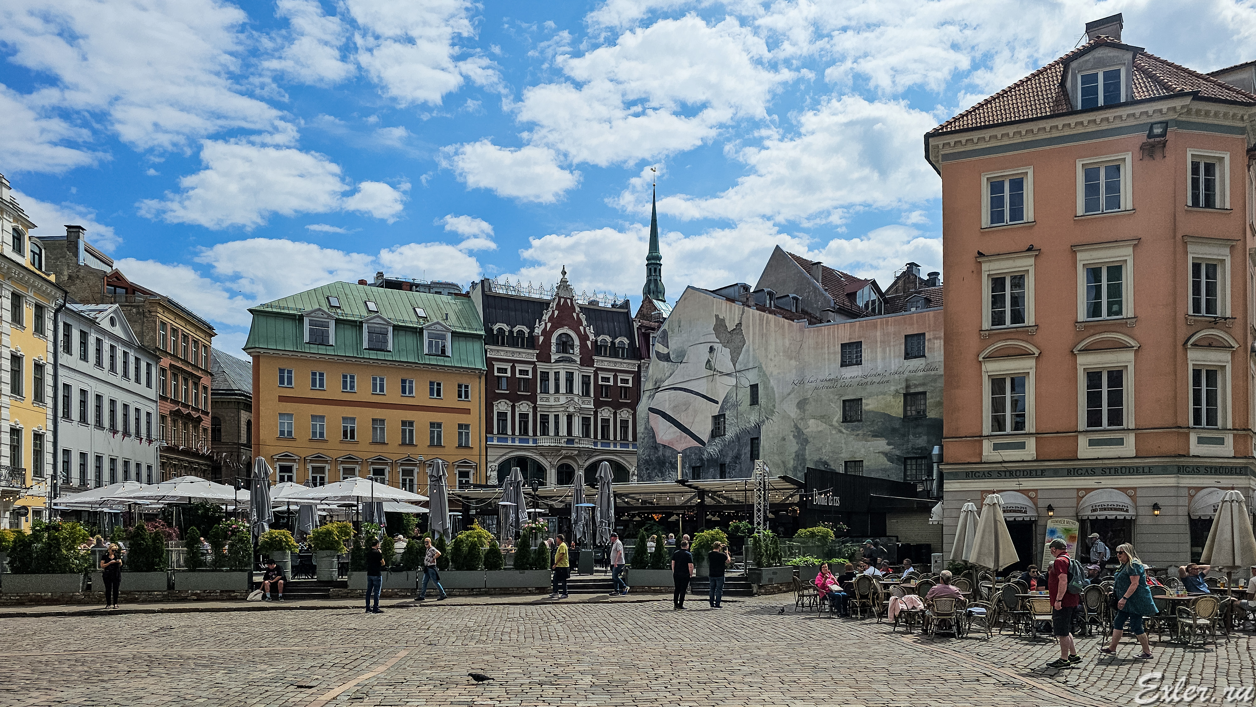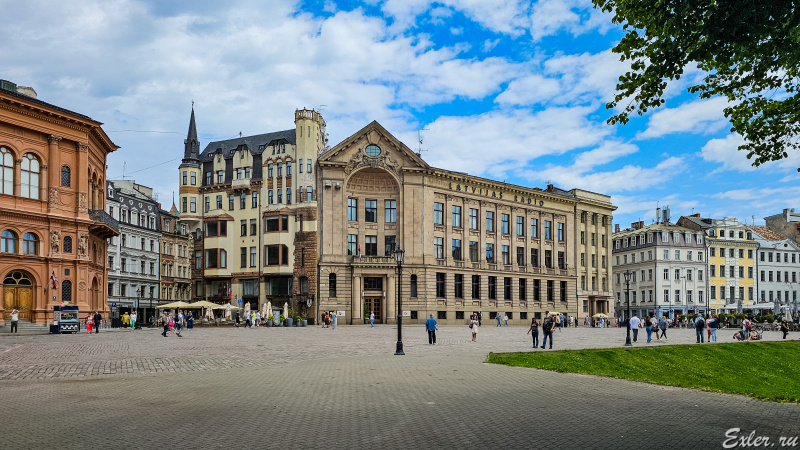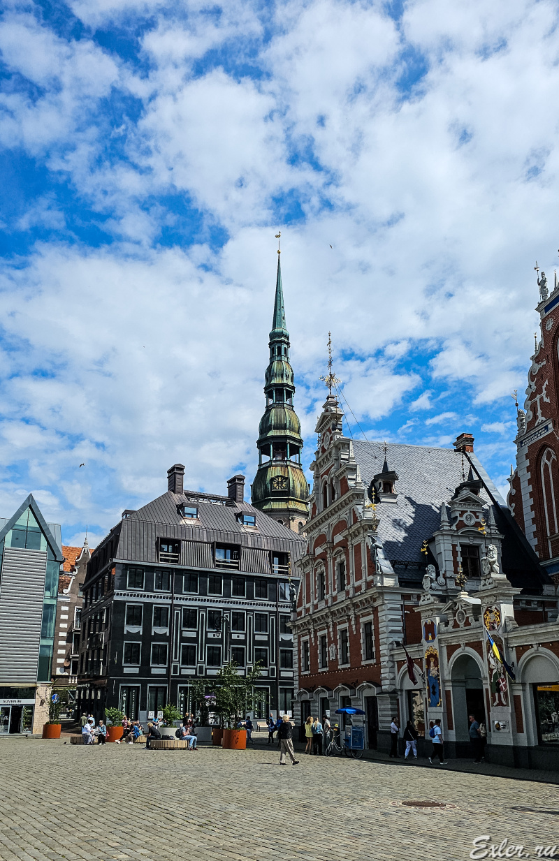 Ратушная площадь, справа - Дом Черноголовых, сзади - Собор Святого Петра, на переднем плане - современное деловое здание, стилизованное под старину.