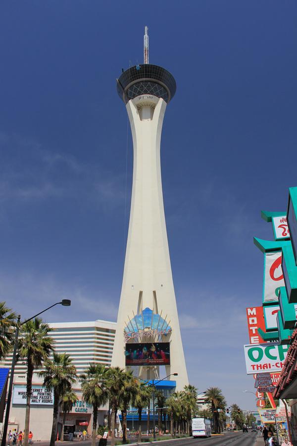 Конечная цель моей прогулки - отель "Стратосфера". Рядом с башней - корпуса отеля. В самой башне также есть номера, на самом верху - обзорная площадка, аттракционы и ресторан (он фигурировал в нескольких фильмах, в частности, в "Тринадцати друзьях Оушена").