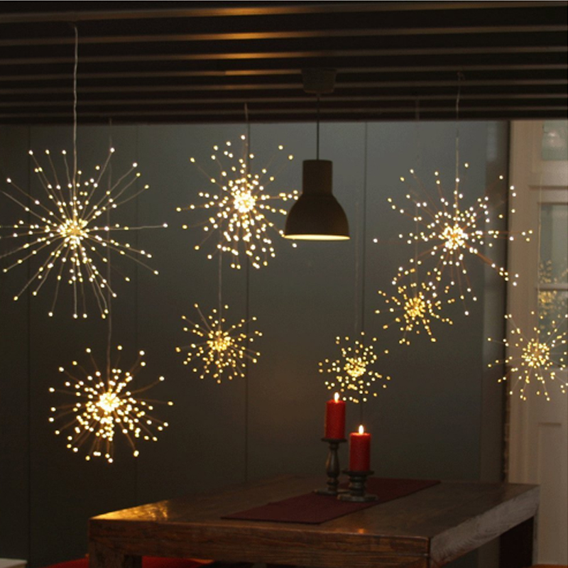 4. Самый необычный вариант - гирлянда-бенгальский огонь. Отличная альтернатива ночнику или звезде на елке (большой такой звезде). Смотрится необычно, но очень красиво. Вроде бы как влагоустойчивая, но не рискнул проверить.Переключение режимов осуществляется с помощью пульта. Для этой гирлянды нужно больше всего аккумуляторов + батарейка в пульт. Также стоит обратить внимание, что цена указана за 1 шт. Приходит довольно быстро.