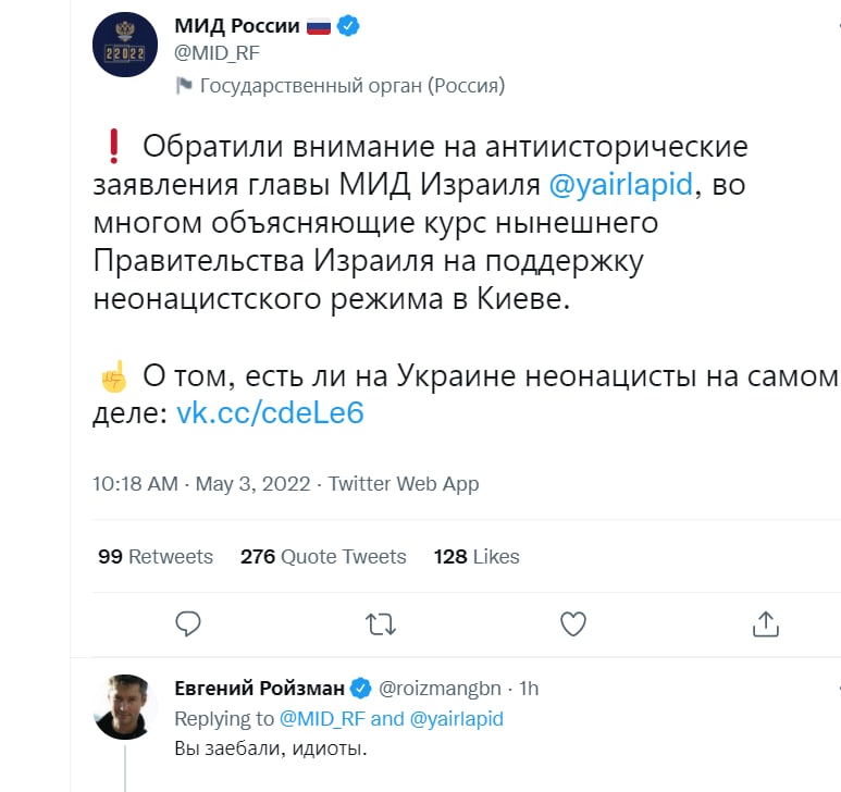 Обратили внимание на антиисторические заявления главы МИД Израиля Яира Лапида, во многом объясняющие курс нынешнего правительства Израиля на поддержку неонацистского режима в Киеве», — говорится в заявлении МИД РФ, опубликованном в Telegram-канале ведомства.