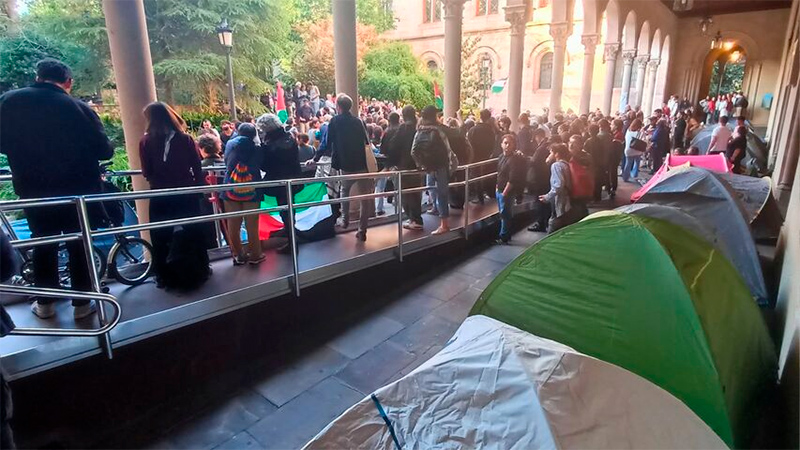 Около 500 человек, включая студентов, преподавателей и сотрудников университета, собрались в монастыре Исторического здания Университета Барселоны, названном Университетами с Палестиной. Оказавшись внутри, они решили разбить лагерь «против геноцида палестинского народа» и осудить «соучастие университета, Женералитата и испанского государства».