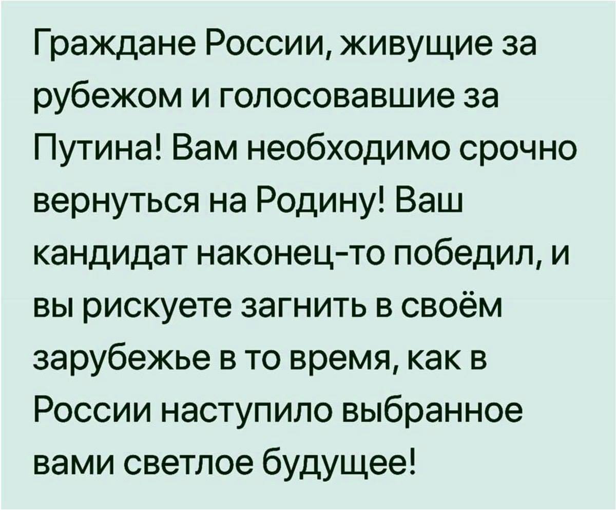 P.S. А вообще, конечно, у меня всегда вызывает крайнее недоумение эта вот манера "любить Путина издалека" у некоторых наших "понаУехавших". Сами они, почему-то, жить в "Великой России Путина" вовсе не хотят, им где-нибудь в Европе явно удобнее...