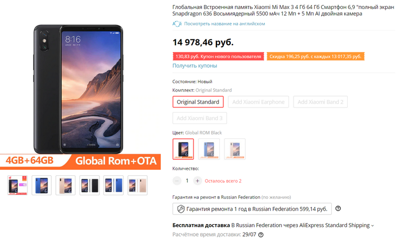 На Aliexpress цена на Mi Max 3 хотя и снизилась, но незначительно - до 15 тысяч рублей (€207, а я покупал за €245). И осталась только черная версия, остальные видать распродали. Скоро и эта закончится.