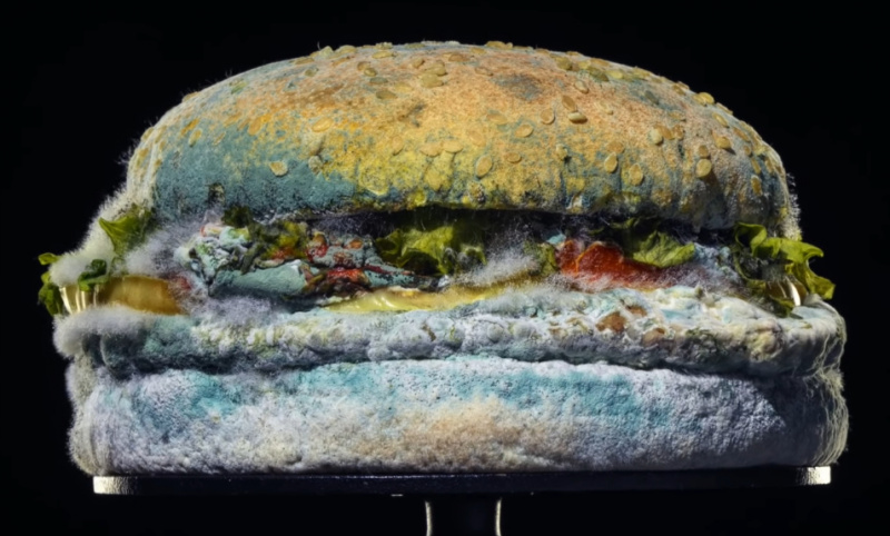 Для "Бургер Кинга" сняли очень, так сказать, своеобразную рекламу. В ней демонстрируется, как их гамбургер с течением времени покрывается плесенью и гниет. Посыл рекламы следующий: они типа как не используют консерванты, поэтому гамбургер гниет очень эффективно.