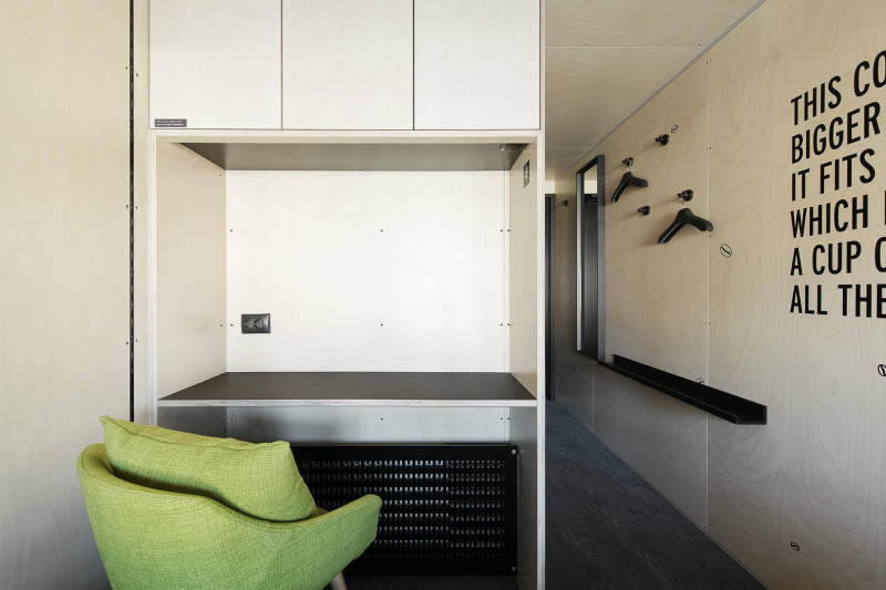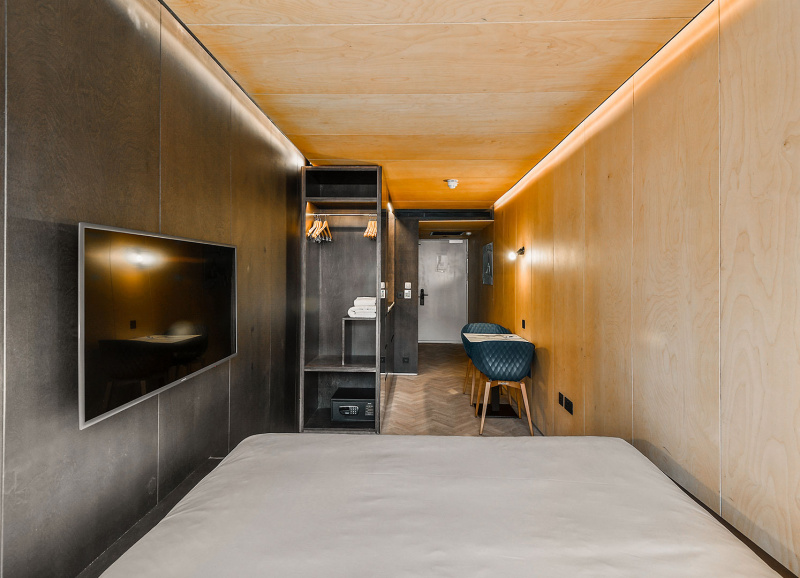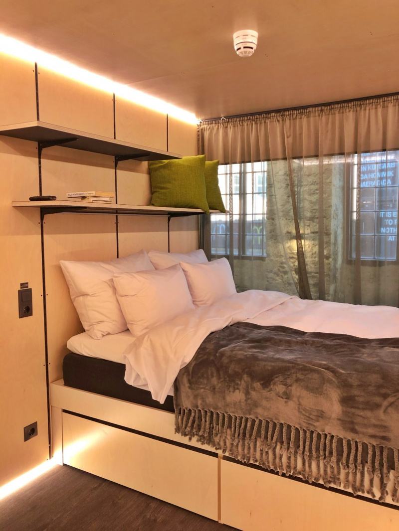 Не могу не отметить: из трех видов номера только последняя фотка сделана в "контейнере", две другие в одной из тех бетонных коробок, что под контейнерами. Эта деталь не немного диссонирует с основной идеей, если я верно ее понял как "можно жить и в контейнере не менее комфортно и за разумные деньги" 😒