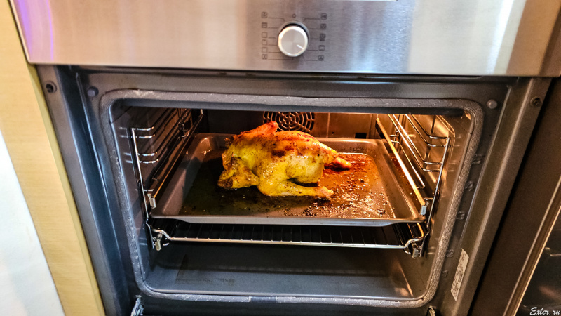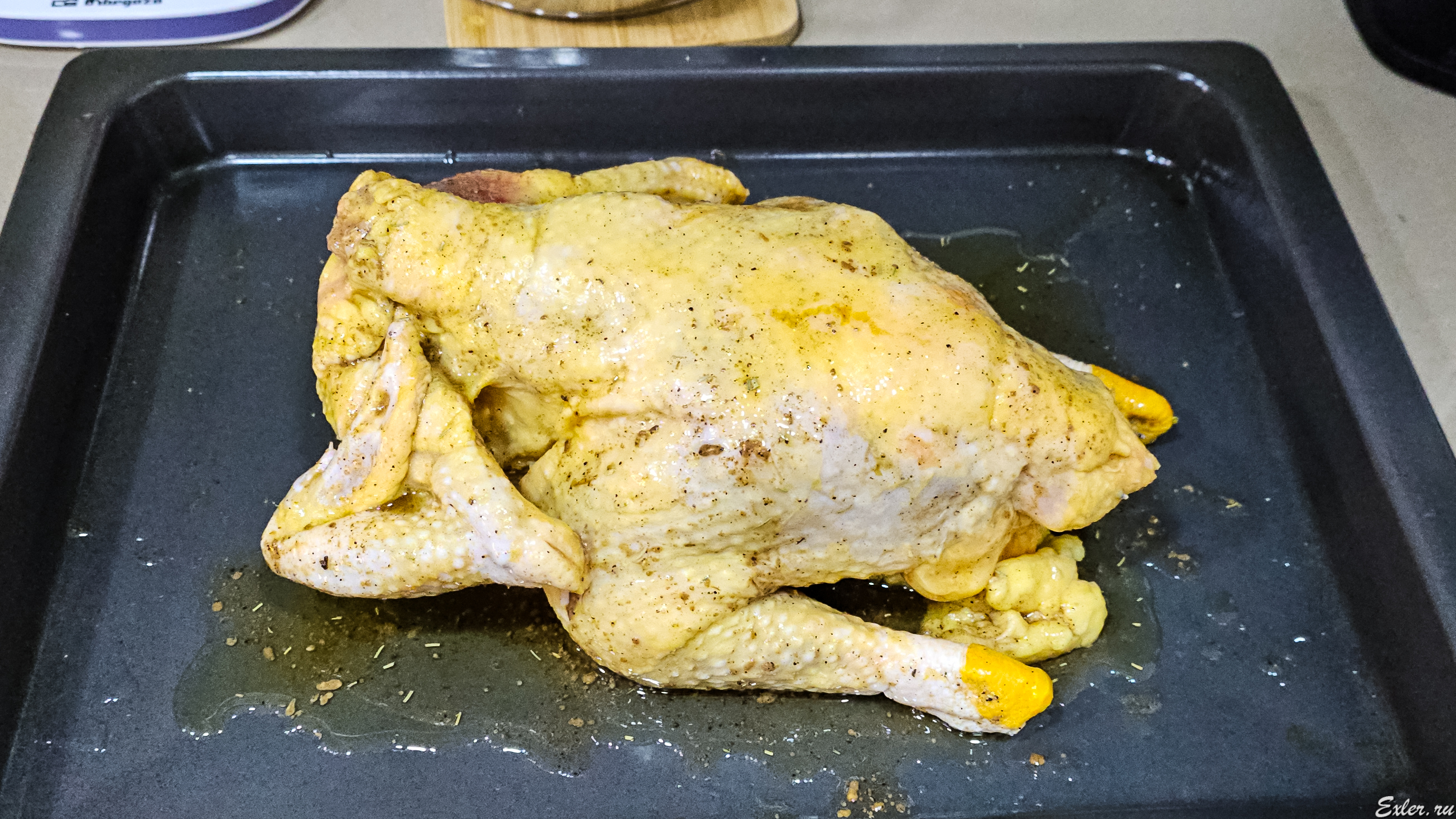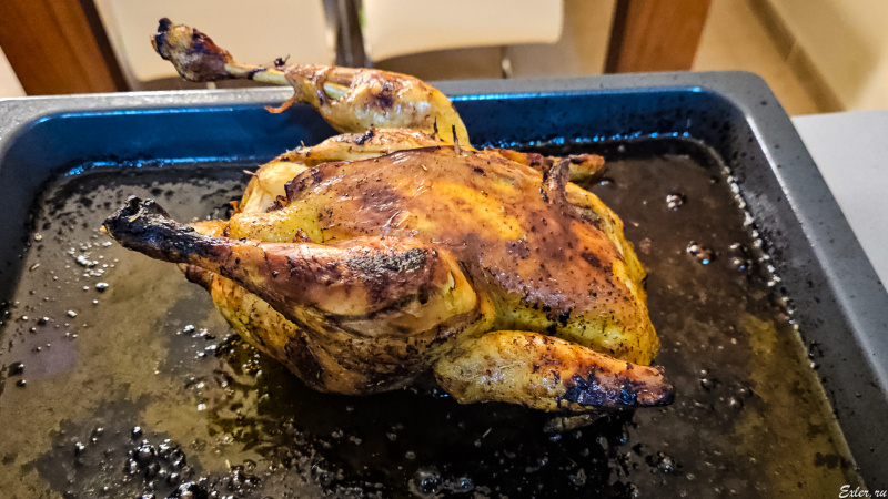 Каждые полчаса поливал выделяемым жиром, через полтора часа перевернул грудкой вверх. Через два часа измерил температуру - так она уже полностью готова (производитель рекомендовал запекать 3 часа в таком режиме). Тогда включил температуру на 200 и подержал еще 20 минут.