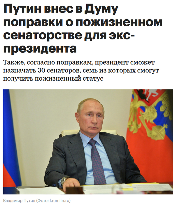 В субботу вечером (!) Путин вносит поправки, позволяющие экс-президенту, то есть ему (а кому же еще?) оставаться пожизненным сенатором