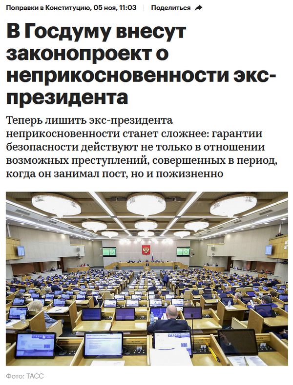 Сегодня в Госдуму внесут законопроект о неприкосновенности экс-президента. Причем там прикольно написано: неприкосновенный он не только за преступления, которые  совершил в период президентства, но и вообще по жизни, то есть и в другие периоды - гуляй, рванина, короче говоря.
