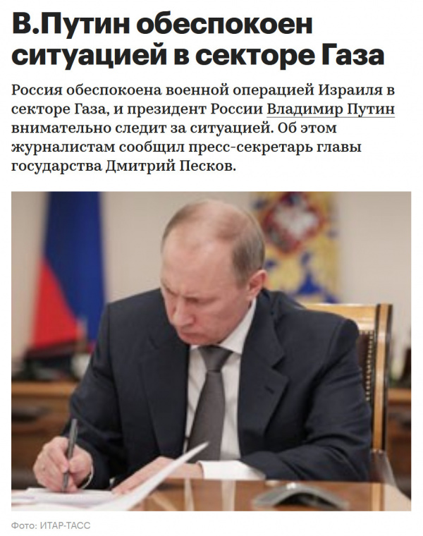 Комсомольцы - беспокойные сердца. Путин - он тоже комсомолец, он выразил обеспокоенность операцией Израиля в секторе Газа. Он беспокоится, что потери среди гражданского населения, которым прикрывается ХАМАС, будут неприемлемыми для Путина. А вот чего его совершенно не беспокоит - так это война, которую он ведет в соседней стране, ничем не угрожавшей путинскому Мордору. Там потери населения в сотни тысяч человек у Путина не вызывают беспокойства, это приемлемые потери. Также потеря в этой войне минимум двухсот тысяч недорогих россиян (по данным британских источников, в других источниках называют цифру в триста тысяч человек) у Путина тоже не вызывает беспокойства и чувства неприемлемости. Вот такой он Путин, загадочный.
