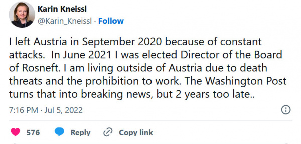 Помните бывшего министра иностранных дел Австрии Карин Кнайсль, на свадьбе которой в 2018 году танцевал Путин? И она настолько его задушевная подружка, что еще и получила пост в совете директоров "Роснефти", где, как вы понимаете, ее зарплата за месяц была несколько выше годовой зарплаты на посту министра иностранных дел.