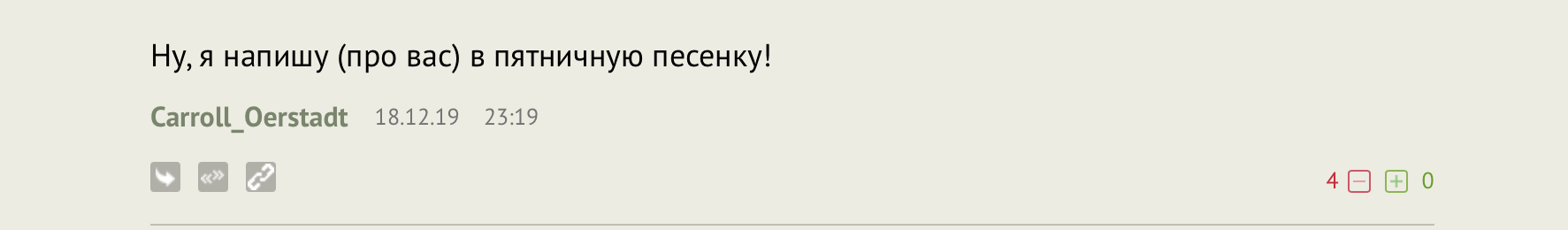 А минус, скорее всего, ставит некто, кто какое-то время назад активно минусил Humanoidа. В моем понимании пятничная песенка настолько позитивное явление, что какой-то негатив здесь просто недопустим. ?