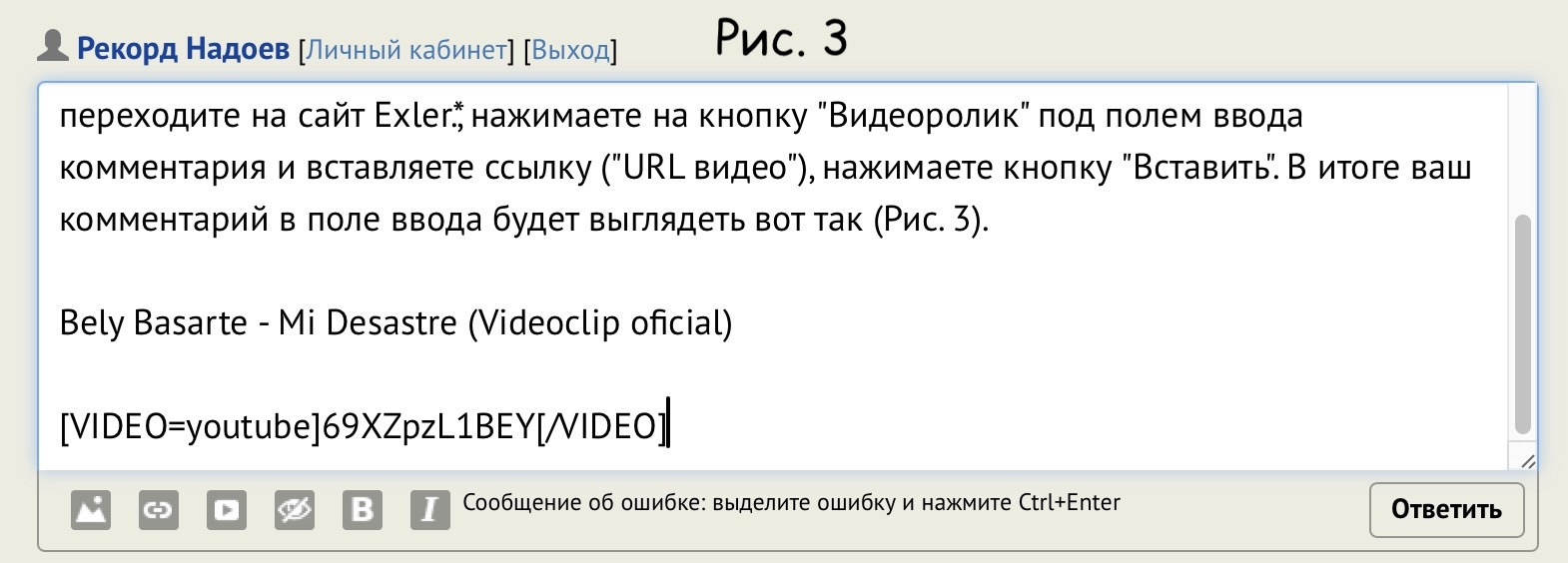 Вам нужна пошаговая инструкция? ОК. Сначала открываете ролик на YouTube и копируете его название (Рис. 1); затем переходите на сайт Exler.*, вставляете название в окне комментария и клавишей Enter делаете отступ в одну или две строки вниз; затем нажимаете на кнопку "Share" под роликом на YouTube и копируете ссылку (Рис. 2); затем переходите на сайт Exler.*, нажимаете на кнопку "Видеоролик" под полем ввода комментария и вставляете ссылку ("URL видео"), нажимаете кнопку "Вставить". В итоге ваш комментарий в поле ввода будет выглядеть вот так (Рис. 3).