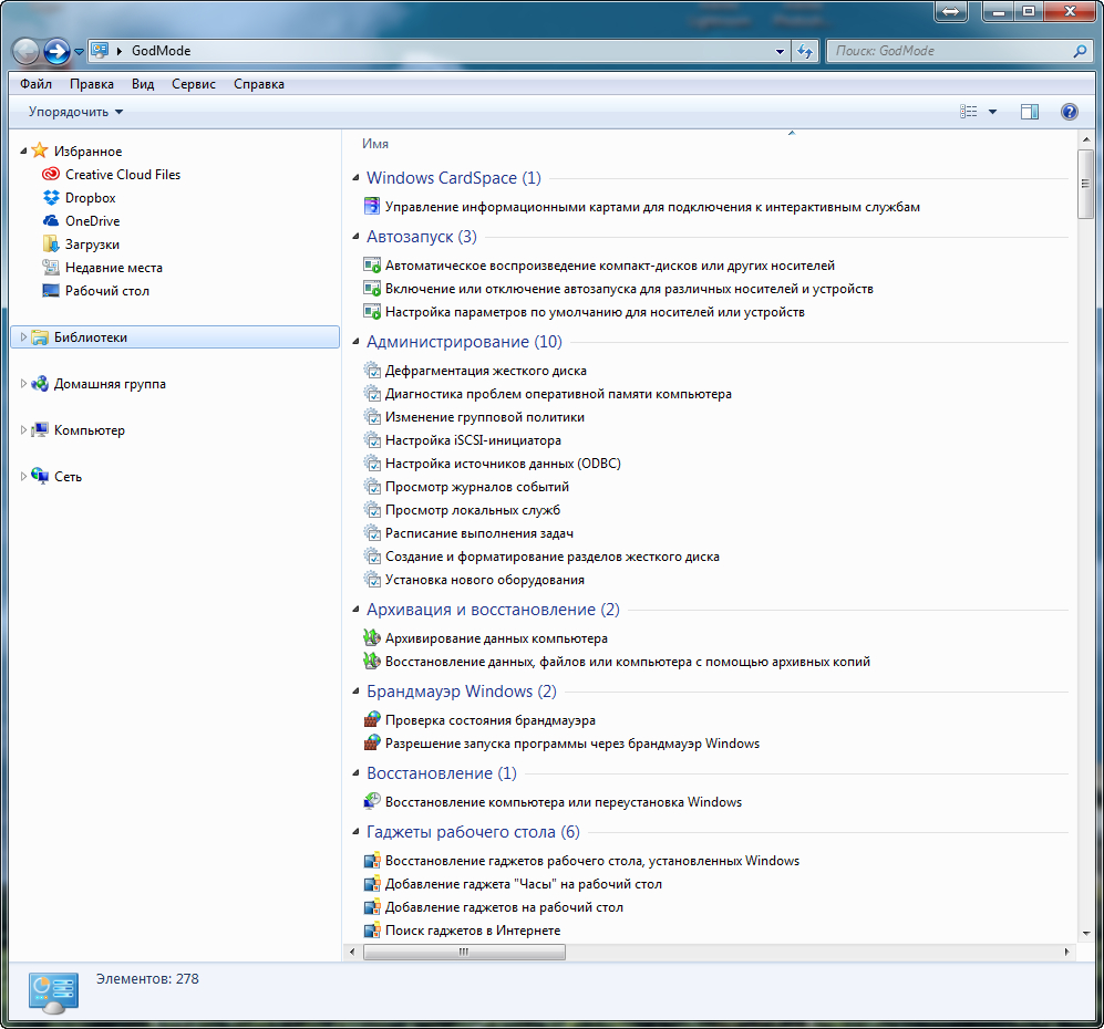 В созданной папке появится доступ к самым разнообразным системным настройкам. Полезная штука.
