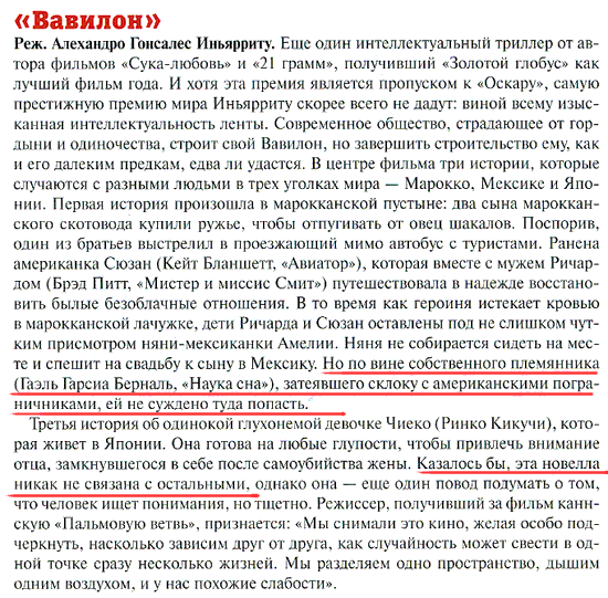 "Вавилон" я посмотрел, рецензия будет в четверг. Хорошее кино. Хотя "21 грамм" мне понравился больше. Но это все-таки разные фильмы.
