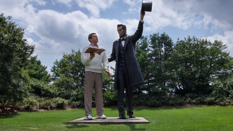 Гигантский Линкольн. В три человеческих роста. По деревьям видно.