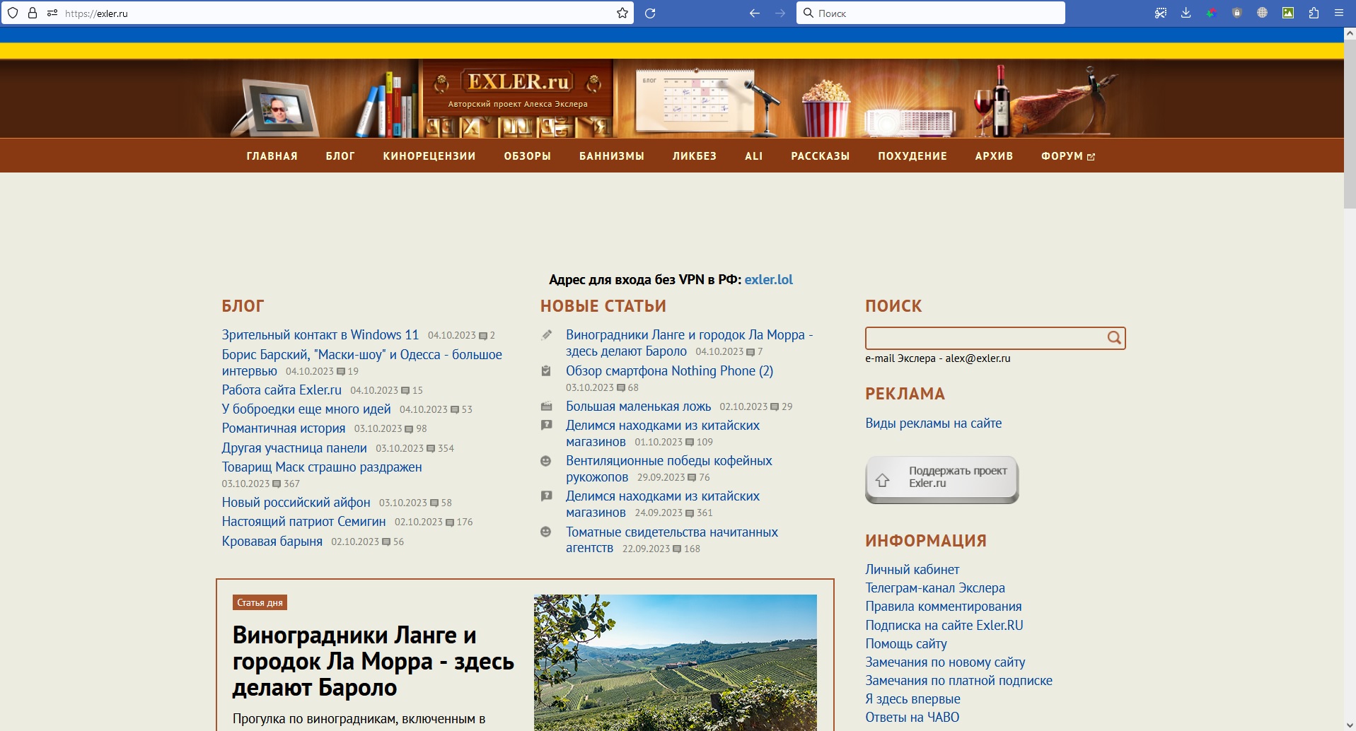 Домен www.exler.ru заблокирован на территории России за нарушения по статье 15.3 (якобы за призывы к массовым беспорядкам). Так что по данному адресу сайт доступен только через VPN. Также они постоянно блокируют новые адреса сайта, но мы при каждой блокировке немедленно вводим в строй новый адрес, по которому сайт в РФ доступен без VPN. Получить новый адрес вместо заблокированного можно на специально для этого созданном сайте exler.world. Также новый адрес я сразу указываю сверху на главной странице.