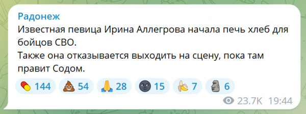 Интересно, где у Аллегровой находится та сцена, где сейчас правит Содом? И зачем ей на эту сцену вообще выходить, шальной императрице? Пускай действительно лучше хлеб печет, все каким-то делом занята.