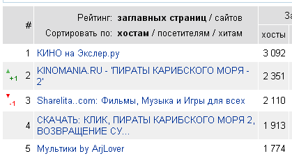 Блин, первое место в разделе "Кино" на "Рамблере" - и всего-то 1600-1800 переходов за сутки. По моим прикидкам должно быть минимум 3-4 тысячи. В разделе "Авто", например, первое место дает тысяч 15. Неужели народ так мало интересуется разделом "Кино"? Странно мне это...