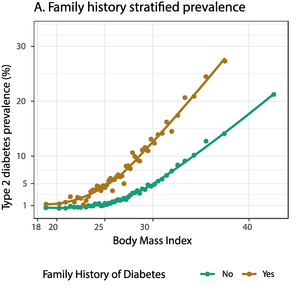 Вот зависимость риска диабета от массы тела. Видно, что при BMI = 25, что рассматривается как верхняя граница нормы, у людей с генетической наследственностью уже риск в 5 раз выше, чем у людей с BMI=20. Т.е. диабет это по сути заболевание, возникающее из-за избыточной массы тела. А людям, у которых есть генетическая предрасположенность просто не повезло и то, что для других нормальная масса тела для них уже избыточная и им нужно иметь гораздо меньшую массу телу, чтобы не было диабета.