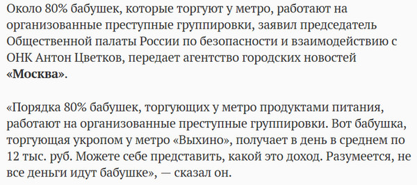 Ну кто-то же этот бизнес у метро крышует. Либо полиция, либо из конкурирующей организации. И, да, бабушки, наверно, что-то им платят. Так что формально господин Цветков прав.