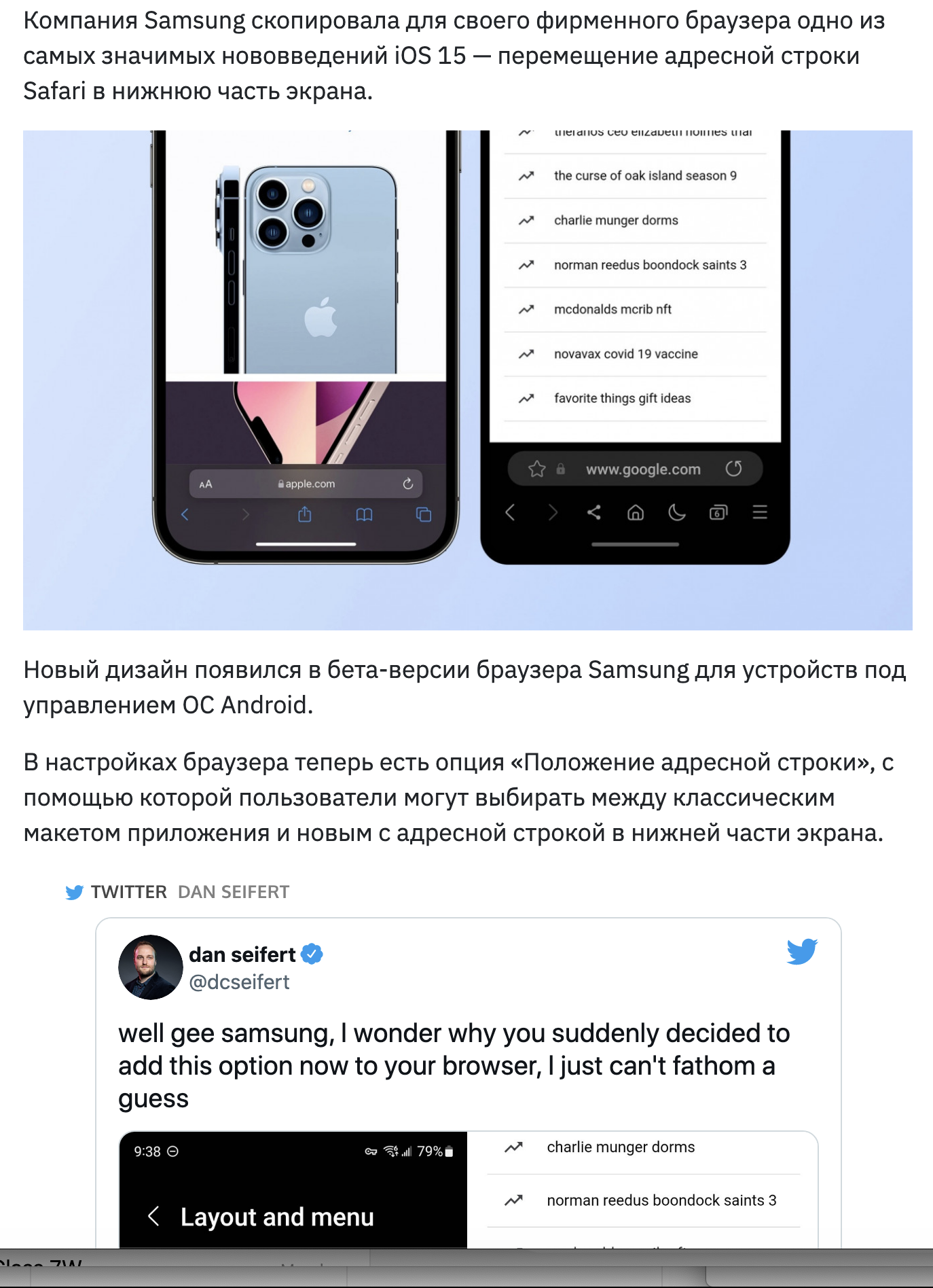 Samsung скопировала самое заметное нововведение Safari из iOS 15