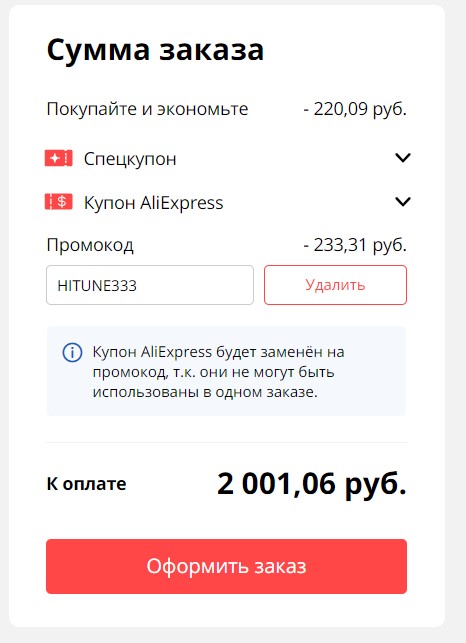Во-вторых применяем промокод (HITUNE333) на - 233,31 руб.