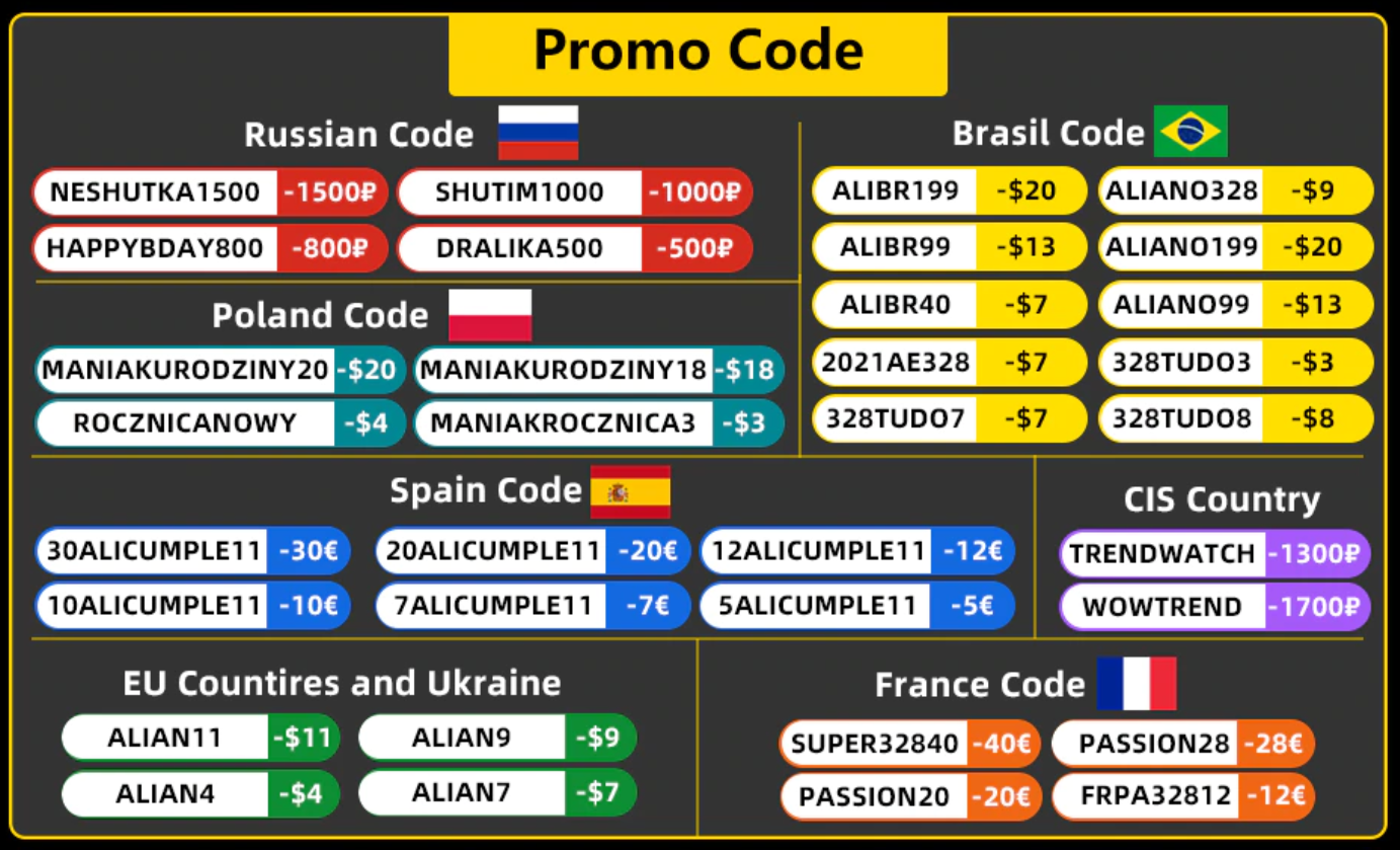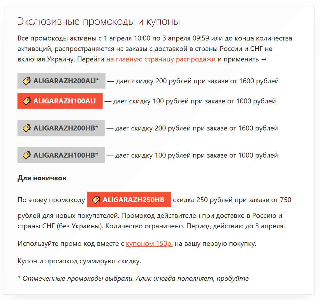 Все промокоды распространяются на заказы с доставкой в страны России и СНГ, количество активаций ограниченно.