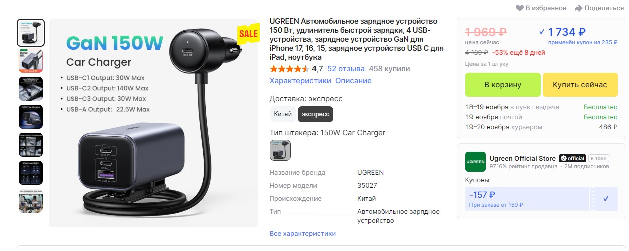 Автомобильное зарядное устройство UGREEN 150 Вт по цене 1734 рубля с купоном продавца на AliExpress.