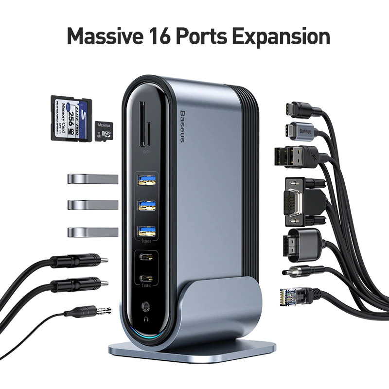 Мощный концентратор от Baseus 16 in 1. Baseus продумали в комплекте даже насадки для розеток различных стандартов, которые крепятся к вилке блока питания.