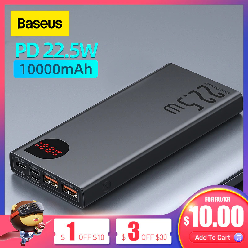 Внешний аккумулятор Baseus на 10 000 мА с быстрой зарядкой. По моему лучшее соотношение цена/качество, у меня уже таких два, пользуюсь больше года, никаких нареканий.