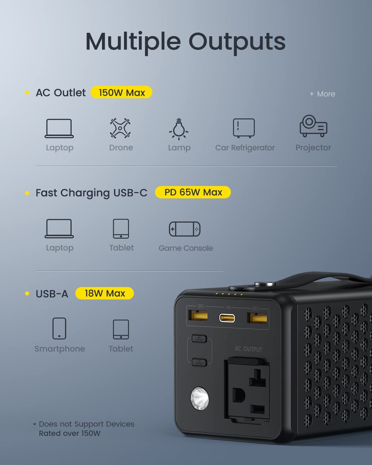 Емкость 26800mAh/96.48Wh. Выходные порты: ТуреC-1шт, АС-1шт, USB-A-2шт. Поддерживает зарядку устройств до 150w. Поддержка быстрой зарядки 65W. Входы-выходы: