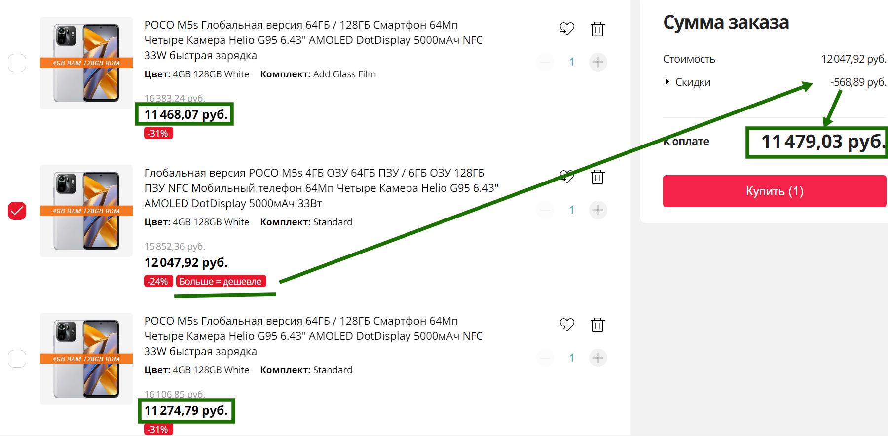 Купон продавца применяется только к самому дорогому варианту и он становится примерно таким же по цене.