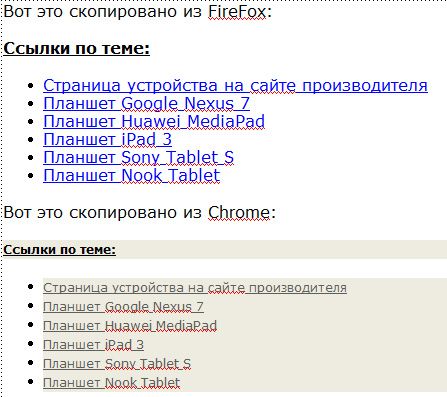 Мне нередко нужно копировать куски текста со ссылками (например, ссылки по теме для обзоров). Firefox такое делал безо всяких проблем - копировал текст с начертанием и прочим плюс ссылки, не сохраняя цвет фона. Chrome при копировании сохраняет цвет фона и гарнитуру шрифта, и этот скопированный текст потом в статью просто так не вставить.