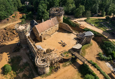 Этот очень необычный проект начался с архитектурной находки. Как-то раз любитель старинной архитектуры Мишель Гийо в 1977 году приобрел ренессансный замок XVII века Сен-Фаржо (Château de Saint-Fargeau) в департаменте Йонна, Бургундия. Замок отреставрировали, он стал популярной достопримечательностью, однако в 1995 году эксперты по средневековым замкам Никола Фошерр и Кристиан Корвизьер, исследуя Сен-Фаржо, выяснили, что Гийо на самом деле приобрел "намного более ценный мех" - в том смысле, что под стенами замка находится военное сооружение XIII века. Мишеля эта находка страшно воодушевила, он собрал компанию своих друзей - любителей старинной архитектуры, историков, археологов и специалистов по французским замкам, - и поделился с ними идеей восстановить крепость XIII века прямо на месте замка Сен-Фаржо. Впрочем, от этой идеи друзья Гийо в восторг не пришли: Мишель, сказали они, зачем тебе разрушать отличный замок, который к тому же так любят туристы? Если уж тебе так хочется воссоздать замок XIII века, так почему бы его не построить "с нуля" где-нибудь в другом месте?