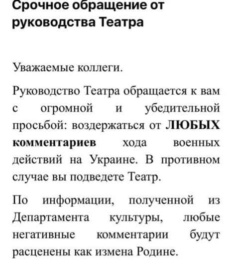 Театр Маяковского рассылает сотрудникам. Говорят, в остальных театрах примерно то же самое Руководству театров конкретно накрутили хвосты - исполняют. Фраза про "будут расценены как измена родине" особенно вставляет. Лучше было бы написать "будут караться расстрелом".